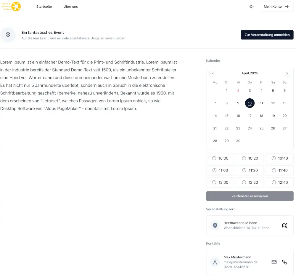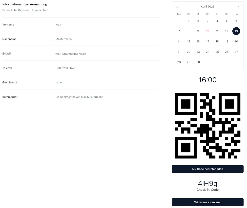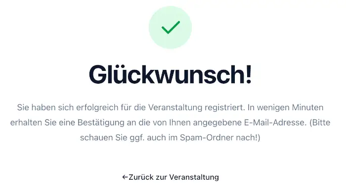 Die potenziellen Teilnehmer:innen erhalten von Ihnen per E-Mail / QR-Code (siehe vorheriger Abschnitt) den individuellen Veranstaltungslink. Ein Klick darauf öffnet die Registrierungsseite, die wie folgt aufgebaut ist: