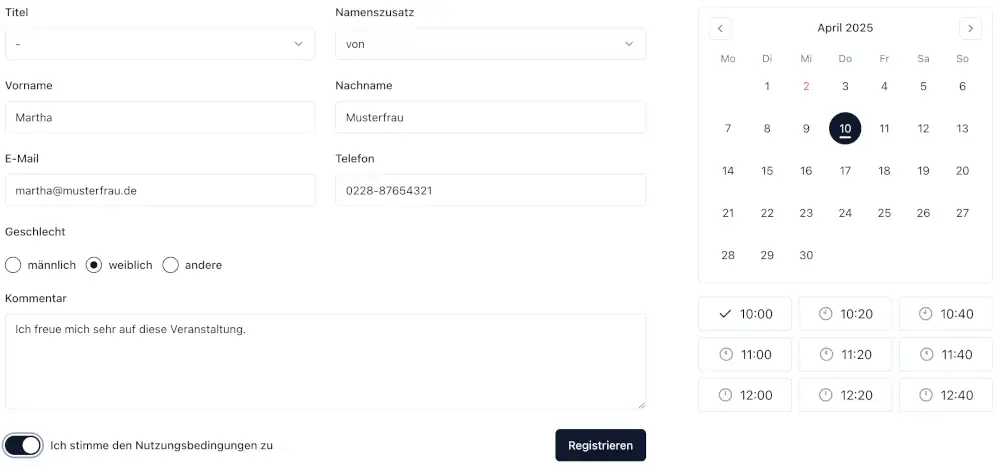- Das Formular ist vollständig durch den Kunden auszufüllen. Je nachdem welche Einstellungen bei der Erstellung der Veranstaltung vorgenommen wurden, sind unterschiedlich viele Eingabefelder zu sehen.